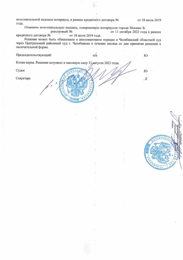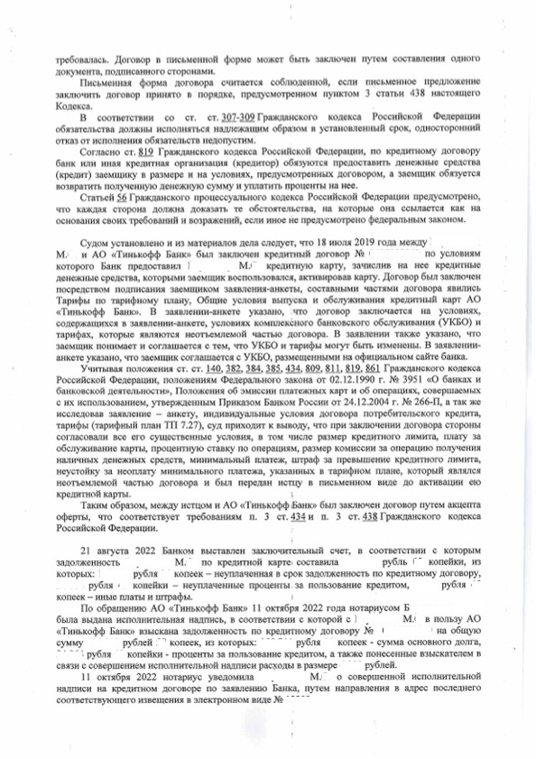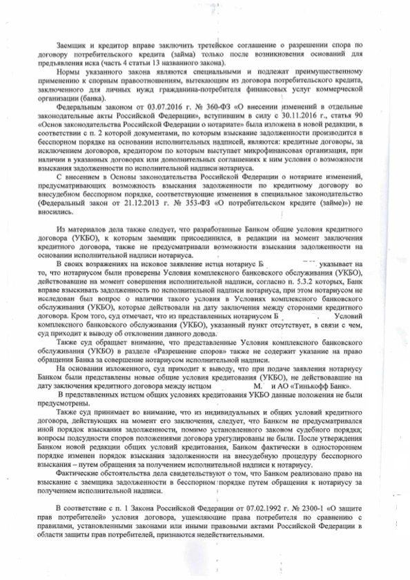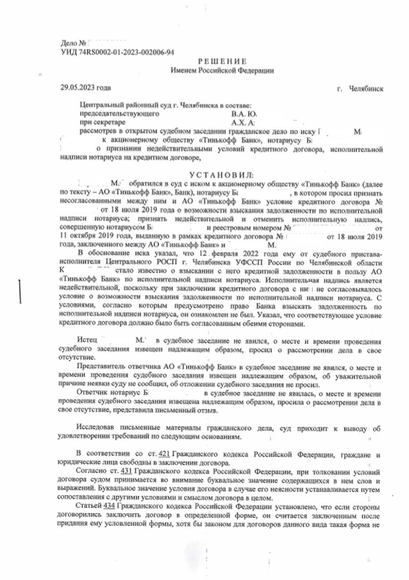 В нашу компанию обратился клиент М., который от службы судебных приставов-исполнителей узнал о том, что в отношении него возбуждено исполнительное производство на основании исполнительной надписи нотариуса в связи с наличием просроченной задолженности в АО «Тинькофф Банк». Юрист нашей компании, ознакомившись с представленными клиентом документами пришла к выводу о том, что совершенная нотариусом исполнительная надпись является недействительной, поскольку при заключении кредитного договора между М. и АО «Тинькофф Банк» не было согласовано условие о взыскании задолженности на основании исполнительной надписи, Банк в одностороннем порядка изменил условия договора. Именно с такими требованиями юрист нашей компании обратился в суд с исковым заявлением. Суд первой инстанции согласился с доводами, изложенными в исковом заявлении, удовлетворив их, в связи с чем признал несогласованными между АО «Тинькофф банк» и М. условие о возможности взыскания кредитной задолженности по исполнительной надписи нотариуса, и, отменил ее. Не согласившись с вынесенным решением АО «Тинькофф Банк» и нотариус подали апелляционные жалобы, однако, суд апелляционной инстанции поддержал вывод суда первой инстанции, в связи с чем апелляционные жалобы были оставлены без удовлетворения. После вступления решения суда в законную силу, возбужденное исполнительное производство в отношении М. было прекращено, взысканные по нему денежные средства возвращены. Кроме того, все понесенные расходы на оплату услуг юриста М. были компенсированы судом в полном объеме.